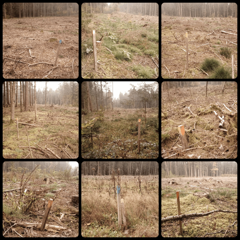 Die Fläche wurde ringsum vermessen und ausgepflockt. Die Vermessungsstöcke sind noch zu sehen. Die Koordinaten des geplanten Windrads befinden sich innerhalb der gerodeten Waldfläche.